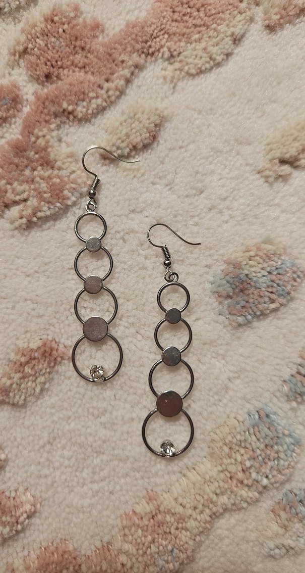 Uzun bej ve gri boncuklu, dairesel tasarımlı minimal bohem stilde küpeler. Günlük kullanıma uygun.