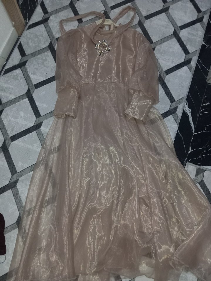Bej renkli, uzun kollu, straplez yakalı, bol kesim vintage bohem tarzda uzun elbisedir. Kumaşı hafif parlak ve desensizdir çok ufak tefek bel ve kol kısmında deformeler mevcut kumaş hassasiyetinden dolayi
