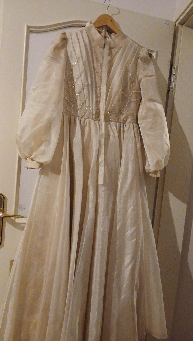 İki defa giyilmiş çok iyi durumda Uzun bej renkli, yüksek yakalı ve uzun kollu, salaş kesim vintage bohem tarzı parlak kumaştan gelinlik elbise.