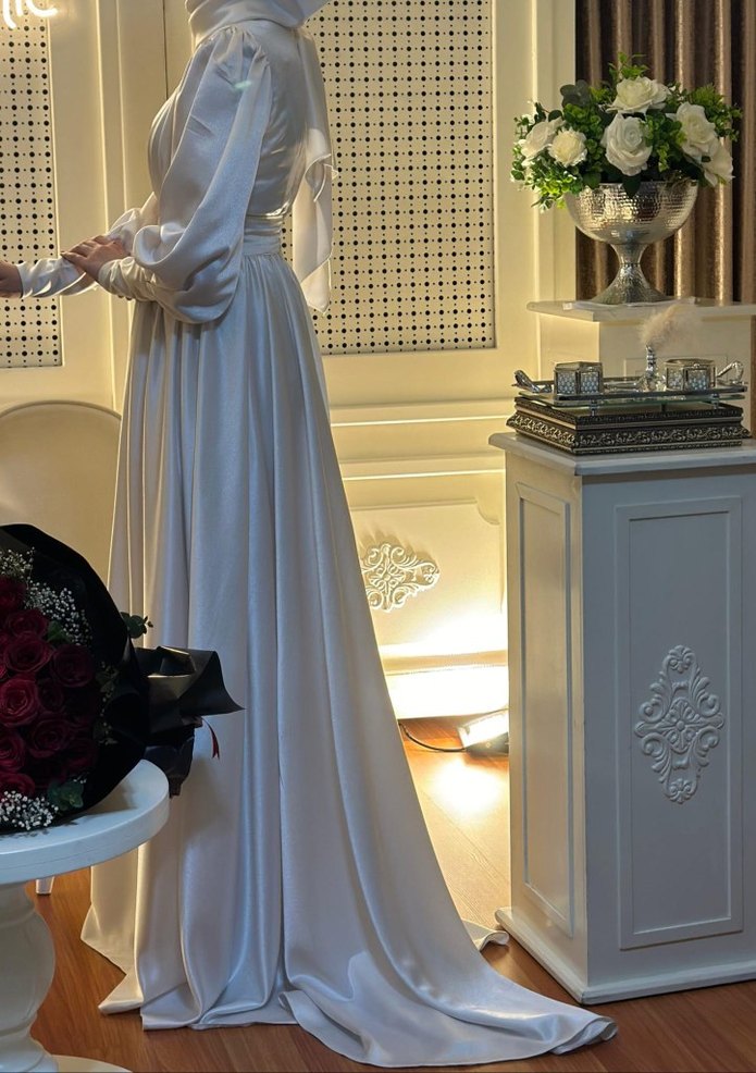 Uzun beyaz A kesim abi'ye yüksek yaka ve askılı kol detaylarıyla klasik zarafeti yansıtır. Düzenli kesimiyle geleneksel Paris tarzına uygundur. 4 saat giyildi nişanımda