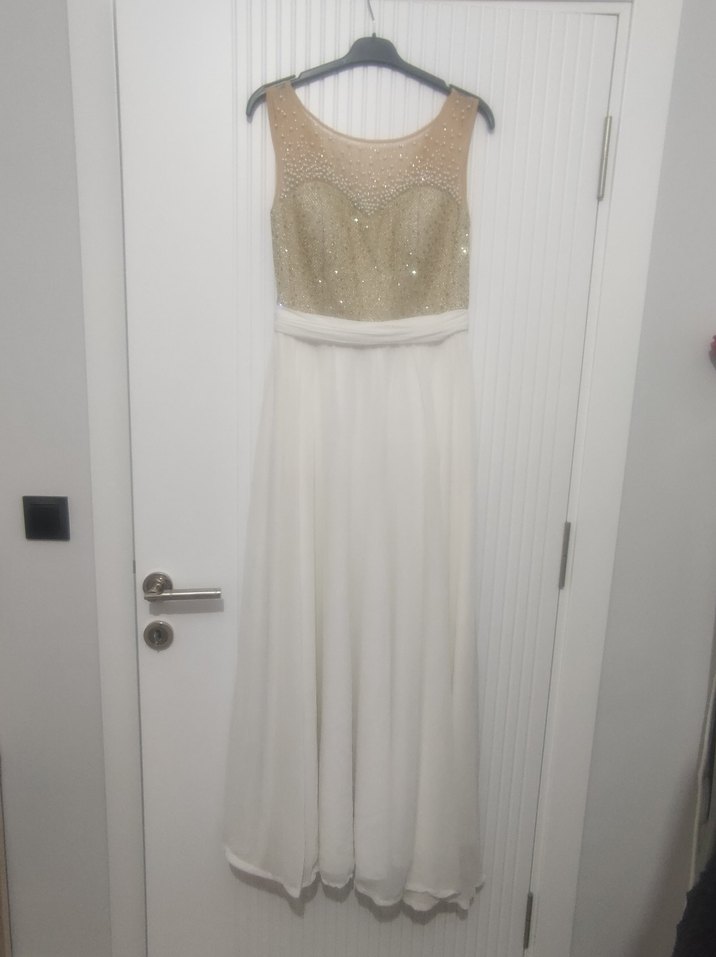 Uzun beyaz abiye elbise, kolsuz ve straplez kesim, drapeli ve bol kesim. Boncuk işlemeli üst kısmı ile şık ve gösterişli görünüyor.
