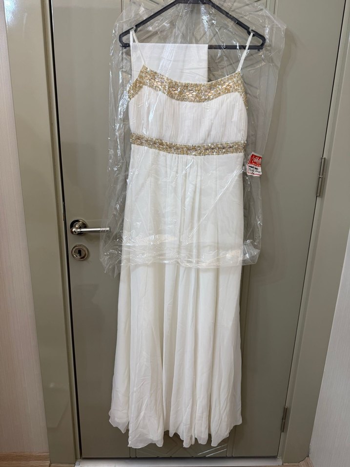 Drapeli, askısız ve kolsuz uzun beyaz gelinlik. Yaka ve bel kısmında altın detaylar bulunur. Klasik ve bohem tarzı yansıtır.