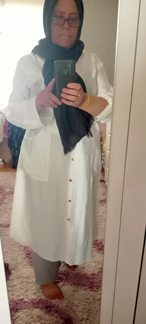 Uzun beyaz ayrobin kap tunik cepli yenid8bol kesim ve drapeli detaylara sahiptir. Notlu yakası ve uzun kolları ile sade, desensiz bohem tarzda günlük kullanıma uygundur.