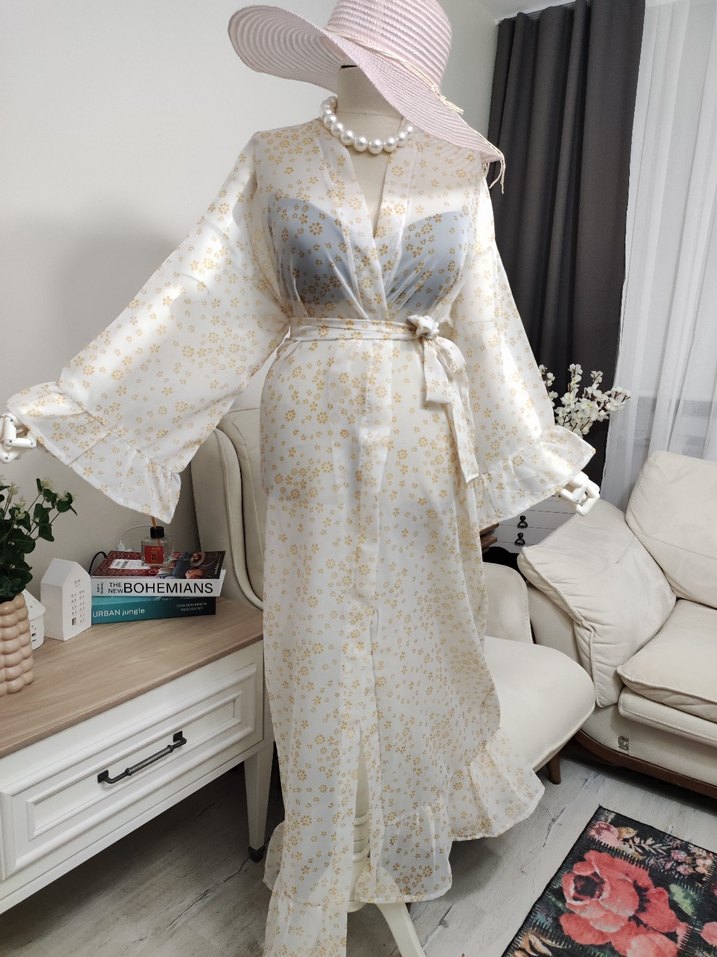 Uzun, bol kesim beyaz pareo, çiçek desenli ve uzun kolludur. Belden bağlamalı ve volanlı etek ucu detayları vardır.