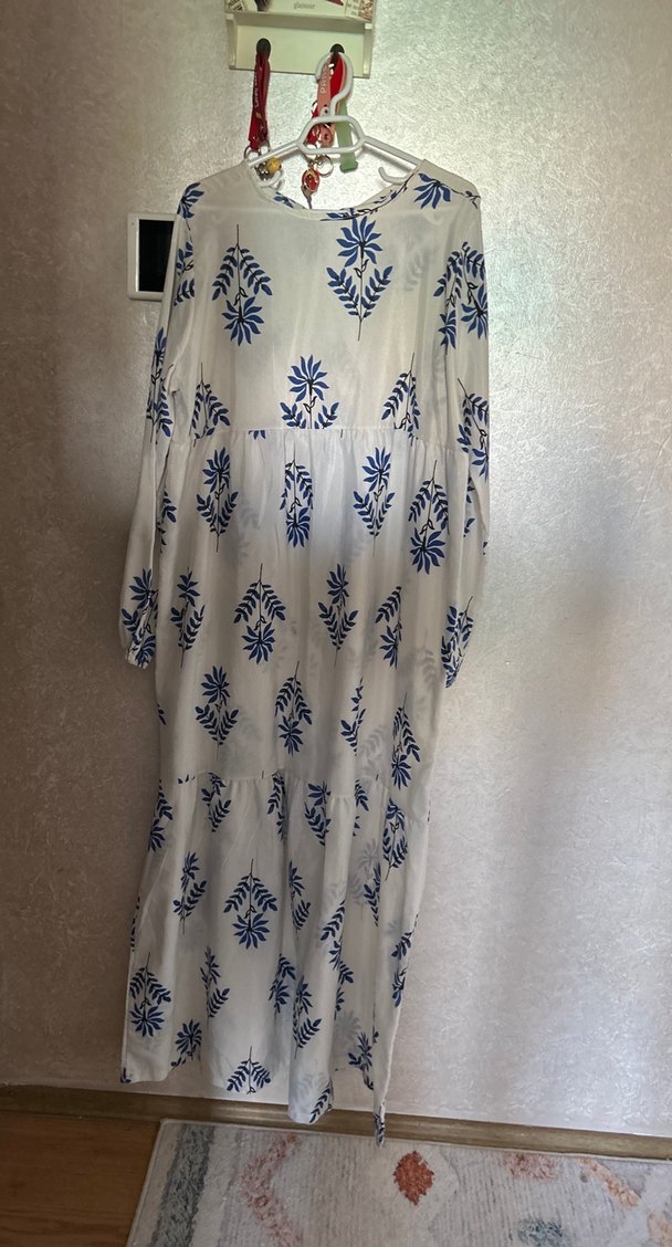 Uzun beyaz elbise, mavi batik desenli, bol kesim ve drapeli detaylıdır. Uzun kollu ve yuvarlak yakalı, yumuşak sentetik kumaştan üretilmiştir. Omuz 40 cm bel 54 cm kol uzunluğu 60 cm kol genişlik 18 elbise boyu 1 40 cm