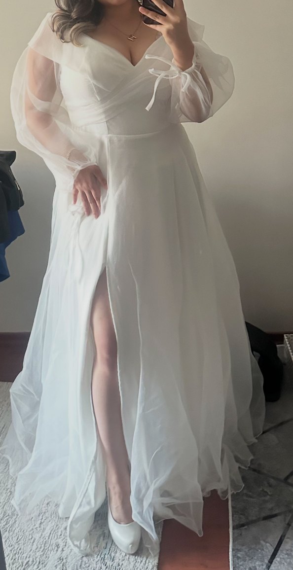 Uzun beyaz gelinlik, straplez yakalı ve ince askılı kollara sahip. Cinsiyet partilerine vs de çok uygundur 44-46 bedene uygundur