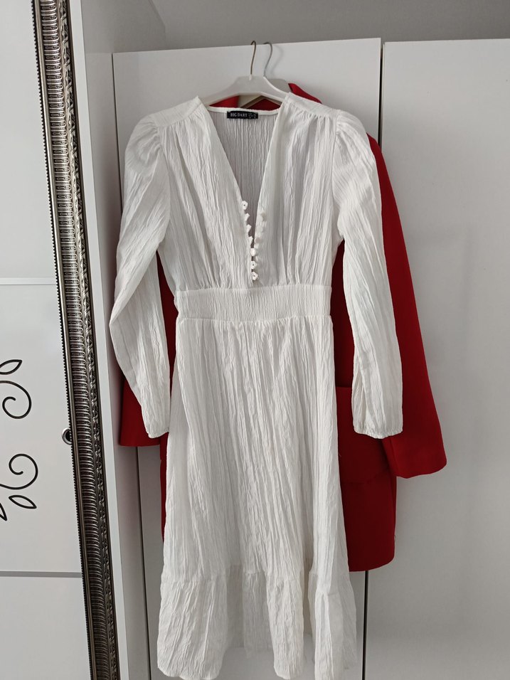 Uzun, beyaz renkte ve bol kesime sahip bu elbise, uzun kolludur. Derin V yaka ve düğme detaylarıyla Paris bohem tarzını yansıtır.
