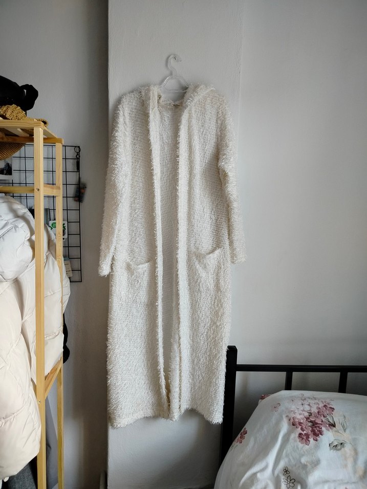 Uzun, beyaz bohem tarzda kadın hırka uzun kollu ve bol kesimdir. Yumuşak, rahat kumaştan yapılmış ve ceplidir.