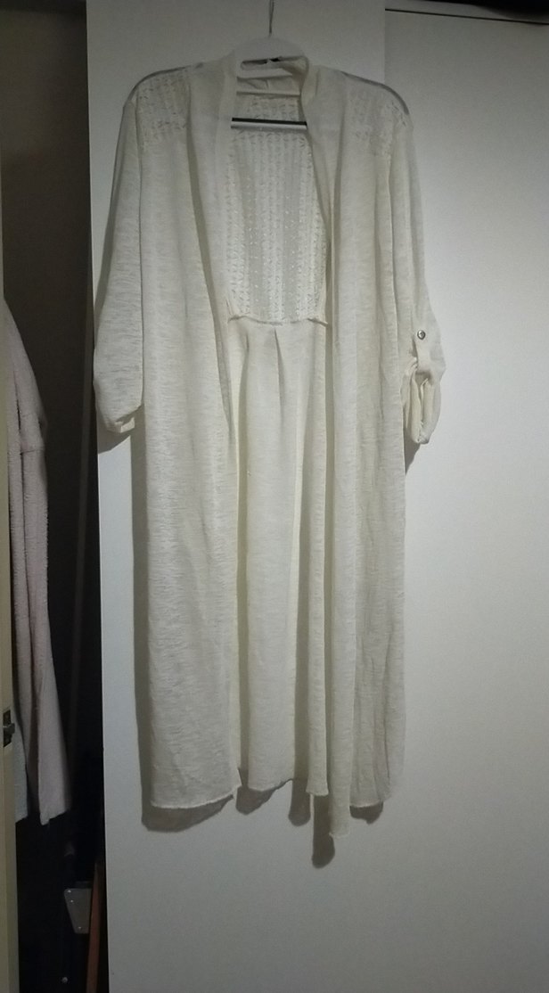 Uzun, beyaz, bol kesim kadın kimono, uzun kollu, sade ve desen içermeyen hafif kumaşla bohem ve minimalist tarzı yansıtıyor.