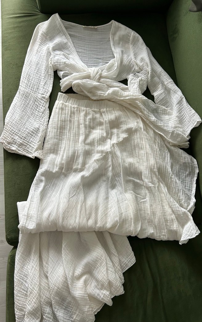 Uzun beyaz bohem tarzda kadın elbise, bol kesim ve askılı kollara sahiptir. Hafif, yumuşak kumaştan üretilmiş ve desensizdir. Rahat ve ferah bir görünüm sağlar.