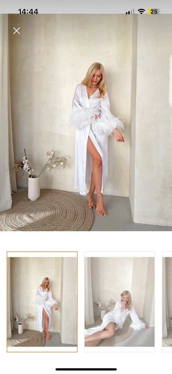 Uzun boy, bol kesim, uzun kollu beyaz sabahlık. Tüy detaylı manşetleriyle bohem tarzını yansıtır. Desensiz ve açık renktir.