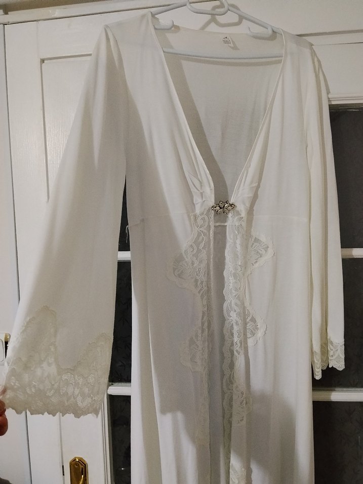 Uzun beyaz sabahlık, bol kesim ve dantel detaylara sahip. Kumaşı hafif rahat Derin yakası ve önünde süslemeli toka bulunur. Bohem tarzı yansıtıyor.boydan dantelli tertemiz sıfır ürün