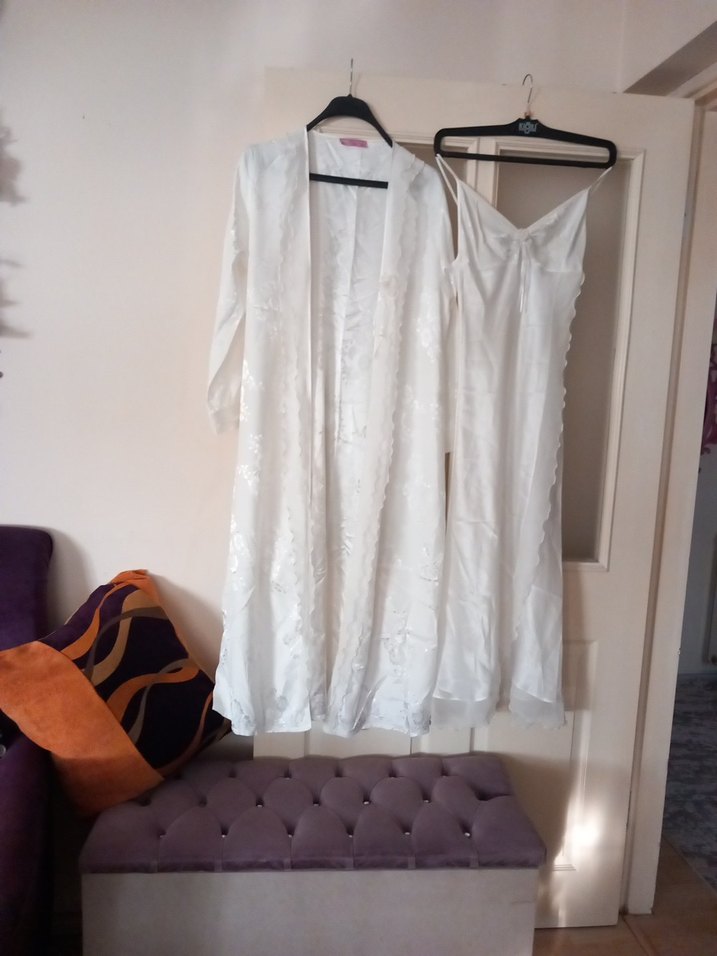 Uzun boy ve bol kesim beyaz renkte, kolsuz, desensiz, Paris bohem tarzında kadın sabahlık.