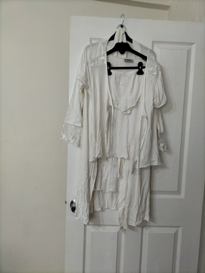 Uzun kollu, bol kesim beyaz sabahlık, bohem Paris tarzını yansıtan zarif dantel detaylara sahip. Rahat ve şık bir tercih. sadece geceliği giyinildi