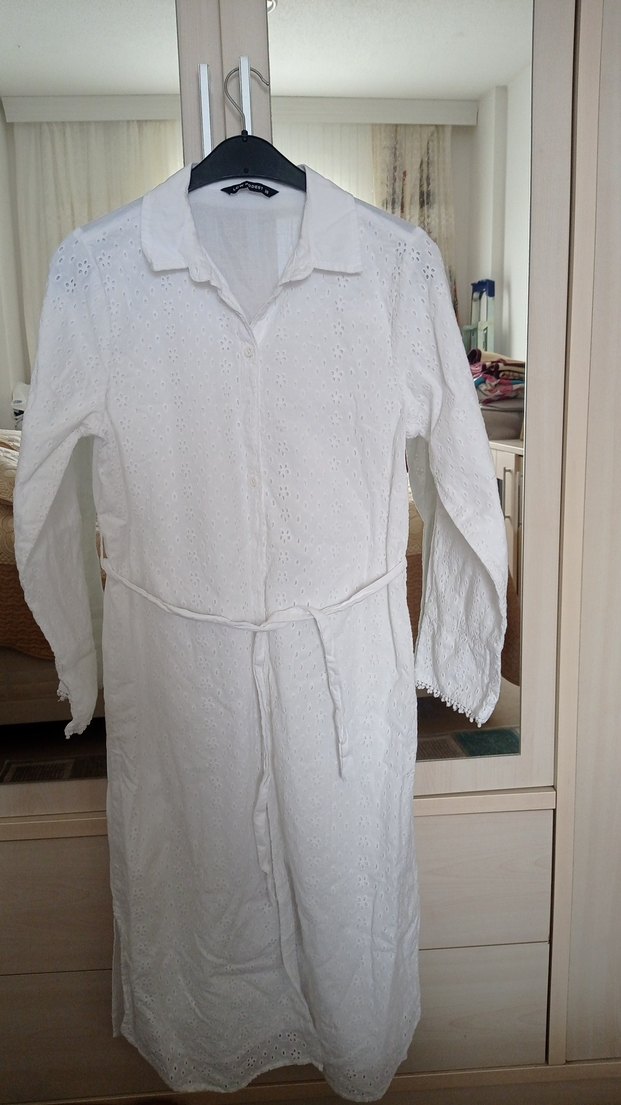 Uzun kollu, bol kesim beyaz kadın tunik gömlek İnce işlemeli kumaş ve belden bağlama detayına sahip bohem tarzda rahat bir model.