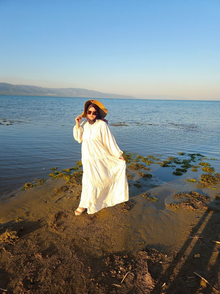 Hafif keten kumaştan, bol kesim, uzun kollu, bohem tarzda, drapeli ve batik desenli, boğazlı uzun beyaz elbise. Sahil için uygun.