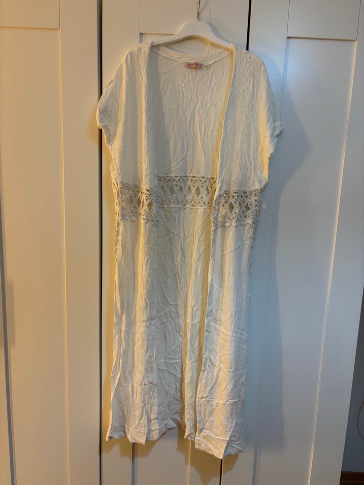 Uzun boy, kolsuz, bol kesim beyaz kadın pareo. Bel kısmında ince dantel detayları bulunan bohem tarzda hafif ve rahat bir üründür.