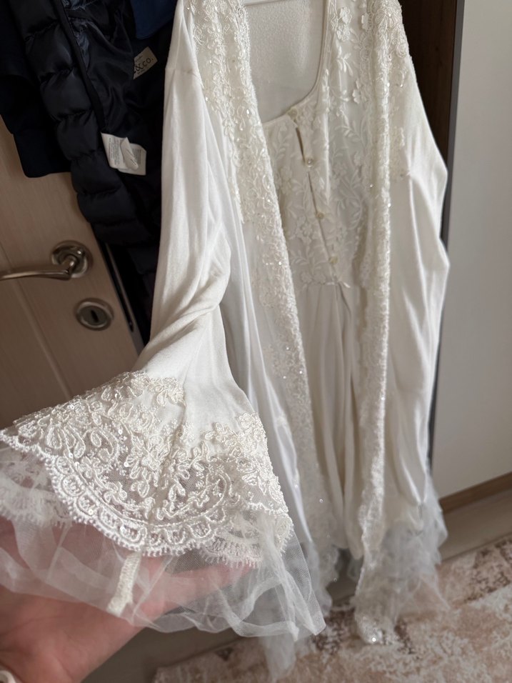 Uzun beyaz kadın elbise, bol kesim ve nakış detaylarıyla bohem tarzını yansıtıyor. İnce askılı kollar ve açık renk şıklık katıyor.