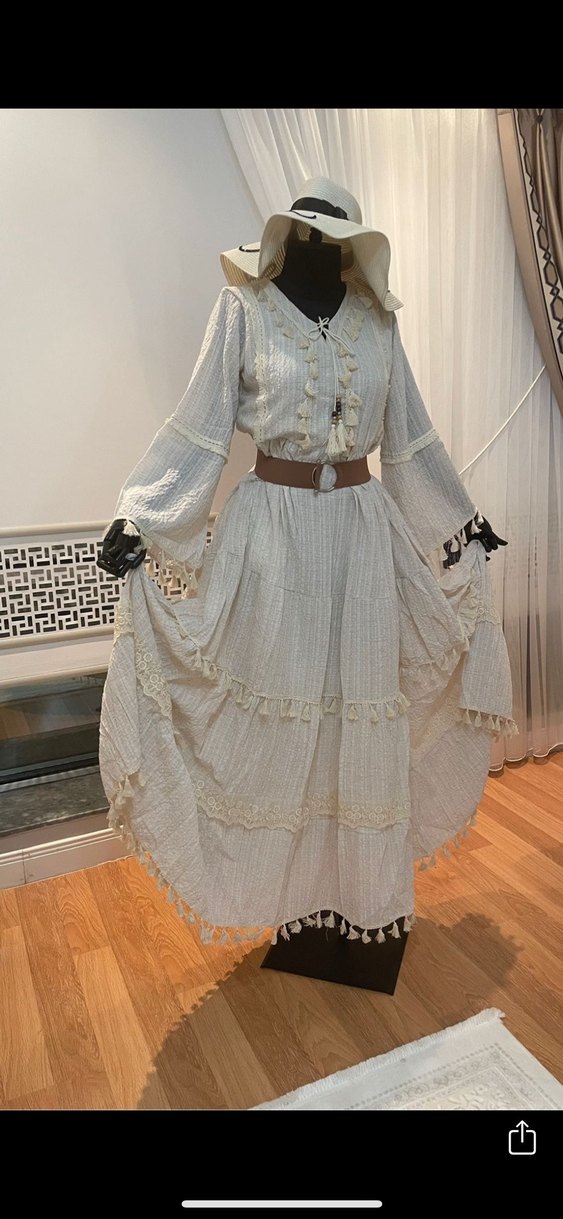 Pamuk kumaştan uzun, bol kesim beyaz elbise. Nakışlı desenler, volan detayları, uzun kollar ve kayık yaka ile bohem tarzına uygun. S m l bedenleri Mevcuttur