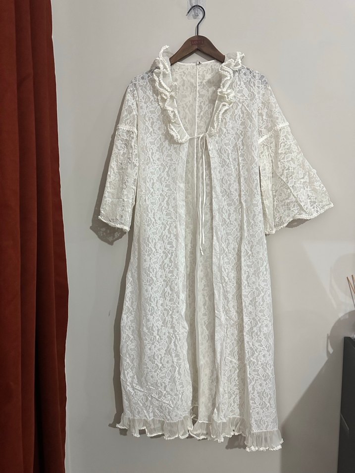 Uzun beyaz sabahlık, nakış detaylı, bol kesim ve kısa kolludur. Fırfırlı yakası ve eteğiyle bohem tarzını yansıtır.