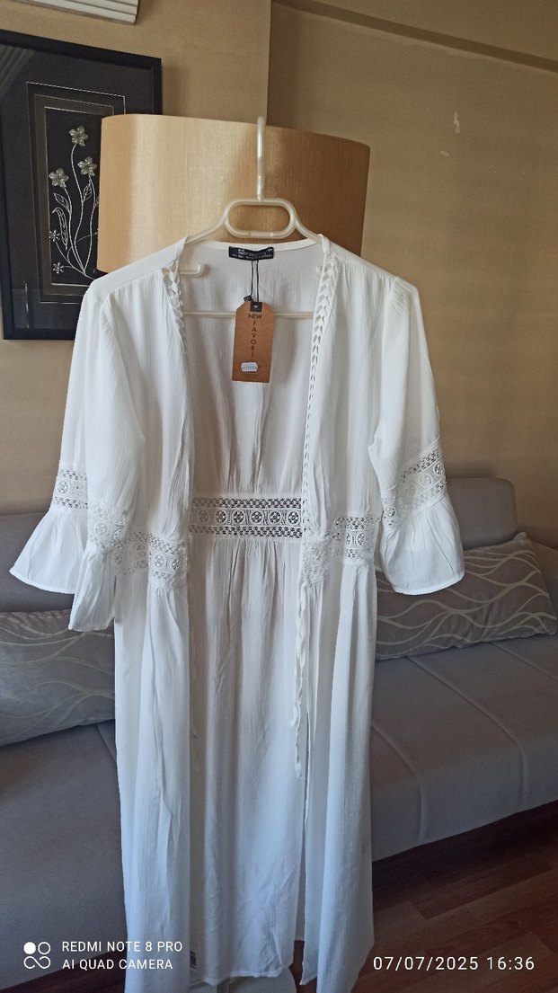 Uzun, beyaz, bohem tarzda, nakış detaylı, ispanyol kollu çok şık kimono etiketli ve sıfır üründür 40 beden ve favori collection ürünüdür