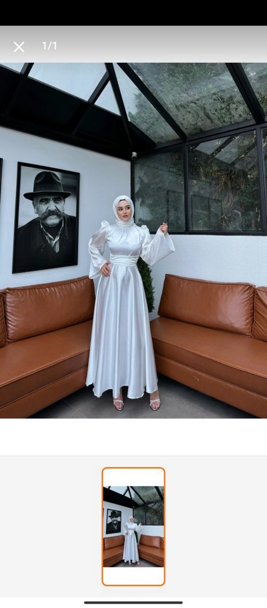 Uzun beyaz abiye, yüksek yakalı ve uzun kolludur. Tesettür ve regular fit kesimiyle sade, bohem tarzda düğünlere uygundur. ✨
