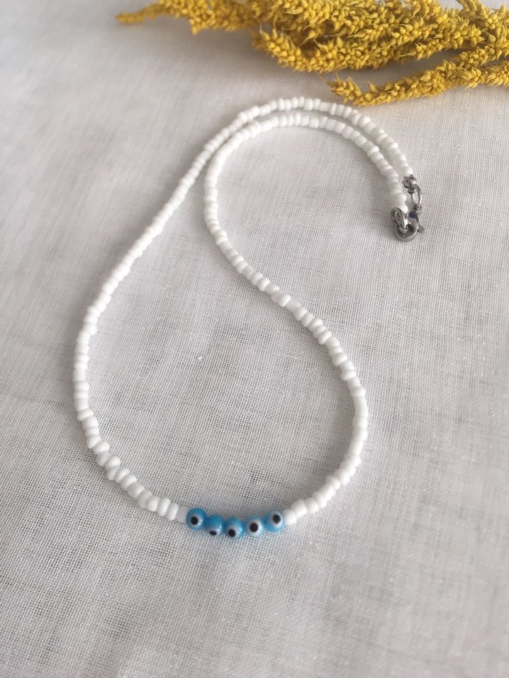Uzun beyaz boncuklardan oluşan bu kolye, minimalist bohem tarzıyla hafif işleme detayları ve mavi boncuk vurgusuna sahiptir, günlük kullanım için uygundur. 40 cm ölcüsü