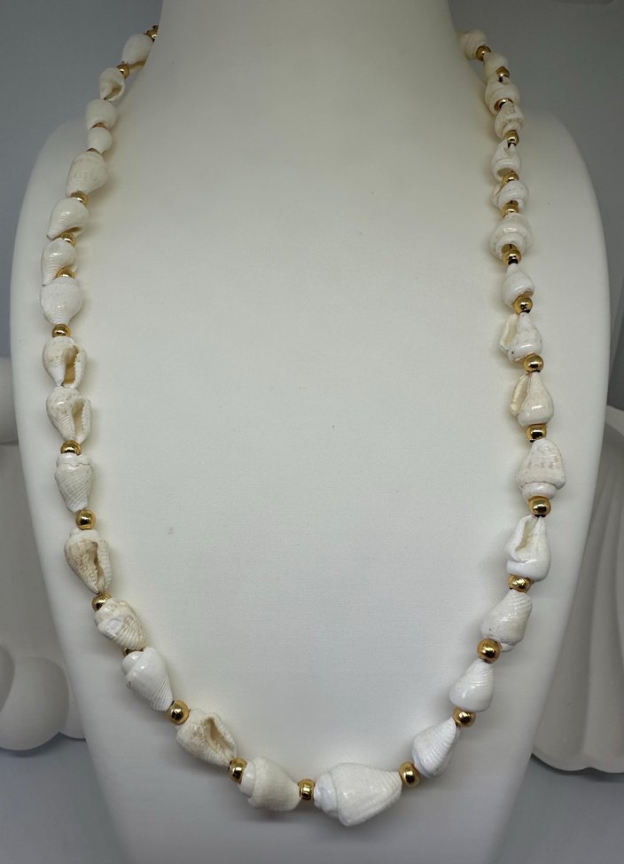 Uzun beyaz boncuklardan oluşan, minimalist ve bohem tarzda, günlük kullanıma uygun bir kadın kolyesi. Doğal şekiller ve küçük altın detaylar içerir.