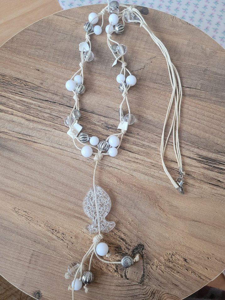 Uzun, beyaz boncuklu, işlemeli detaylara sahip bohem tarzda kolye. Balık şeklinde bir kolye ucu bulunur. Günlük kullanım için uygundur.