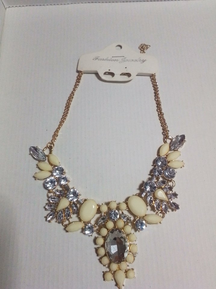 Uzun beyaz boncuklu, bohem tarzda kolye. Hafif renkli taşlar ve gösterişli baskılı desen içerir. Düğünlerde kullanılabilir.