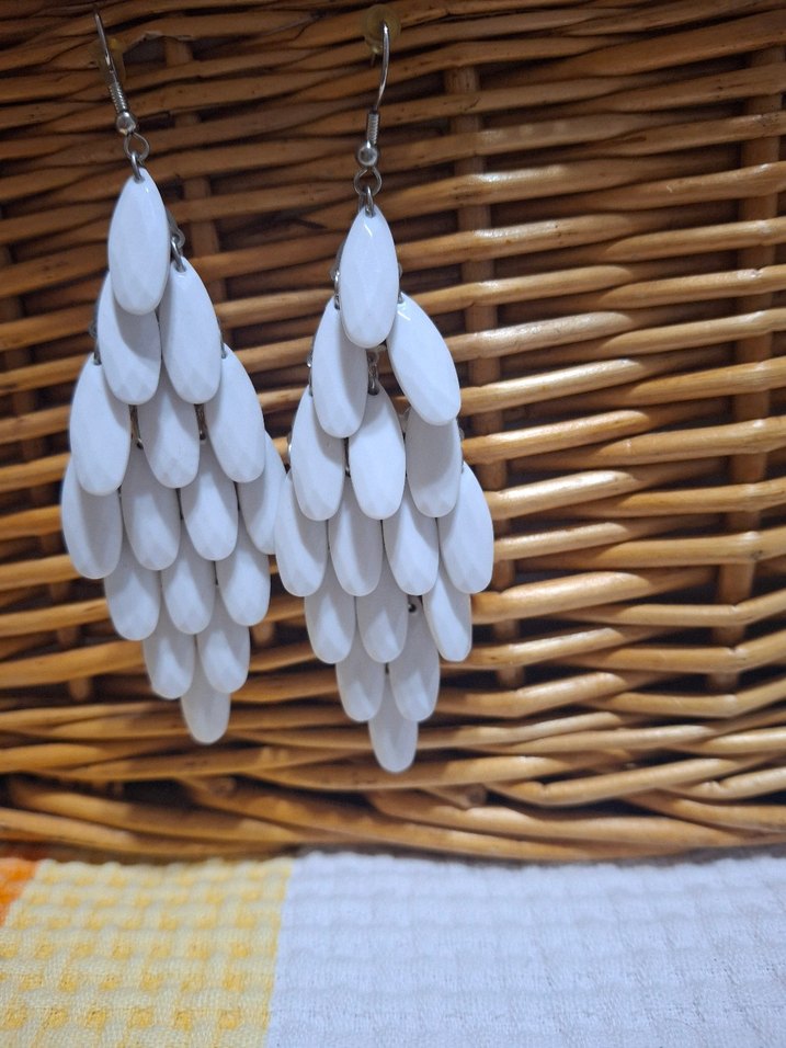 Uzun beyaz boncuklu, bohem tarzda küpeler. Düğün için uygun, katmanlı ve minimal, açık renk tonuna sahiptir. 2 adet