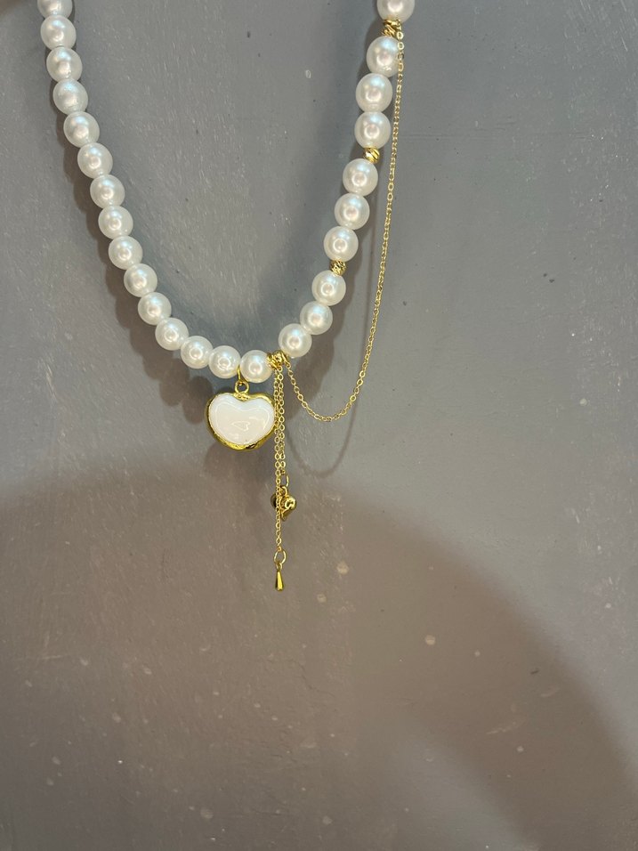 Uzun beyaz boncuklardan oluşan, kalp figürlü kolye ve altın renk zincir detayları ile bohem ve klasik şıklığı birleştirir.