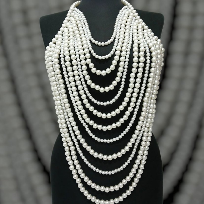 Uzun, çok katlı beyaz boncuklu kolye, bohem tarzda, gösterişli ve modaya uygun parti kombinleri için ideal.