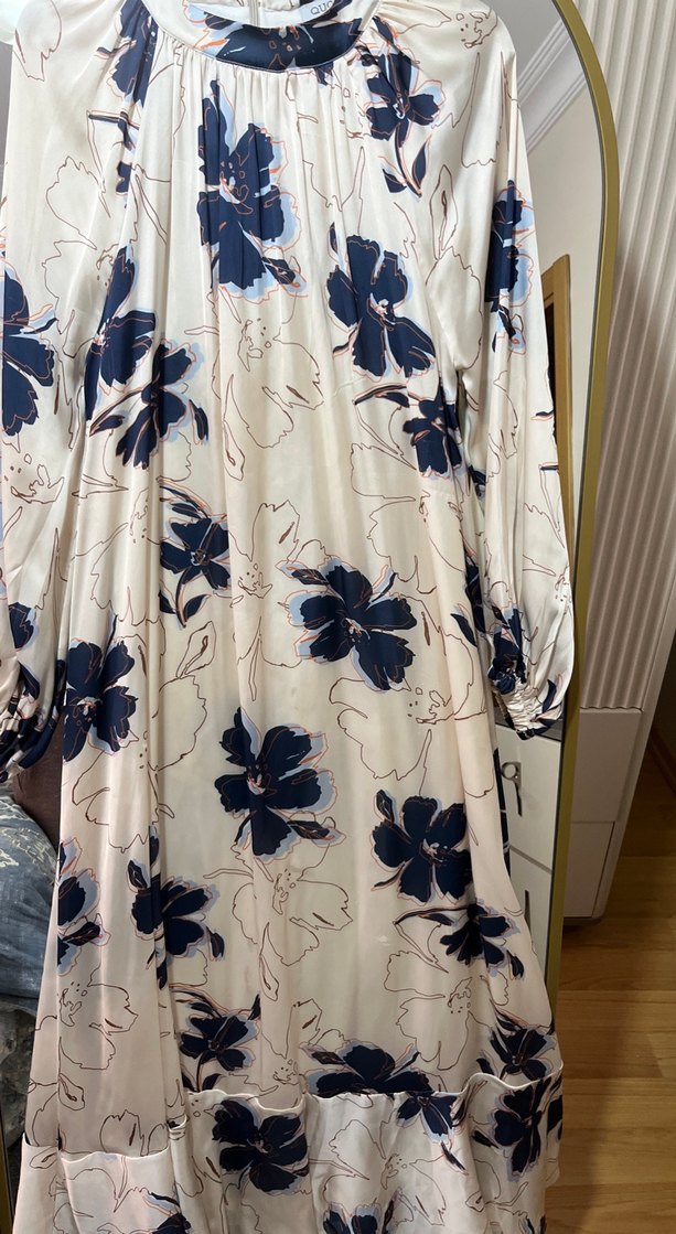 Uzun, bol kesim beyaz elbise, kayık yaka ve uzun kollu. Yumuşak sentetik kumaş, koyu çiçek desenli ve drapeli bohem tarzda.