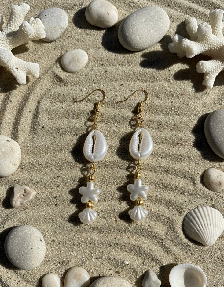 Uzun beyaz deniz temalı boncuklu, işlemeli detaylı küpeler. Plaj için uygun, minimal tasarım, açık renk tonunda.