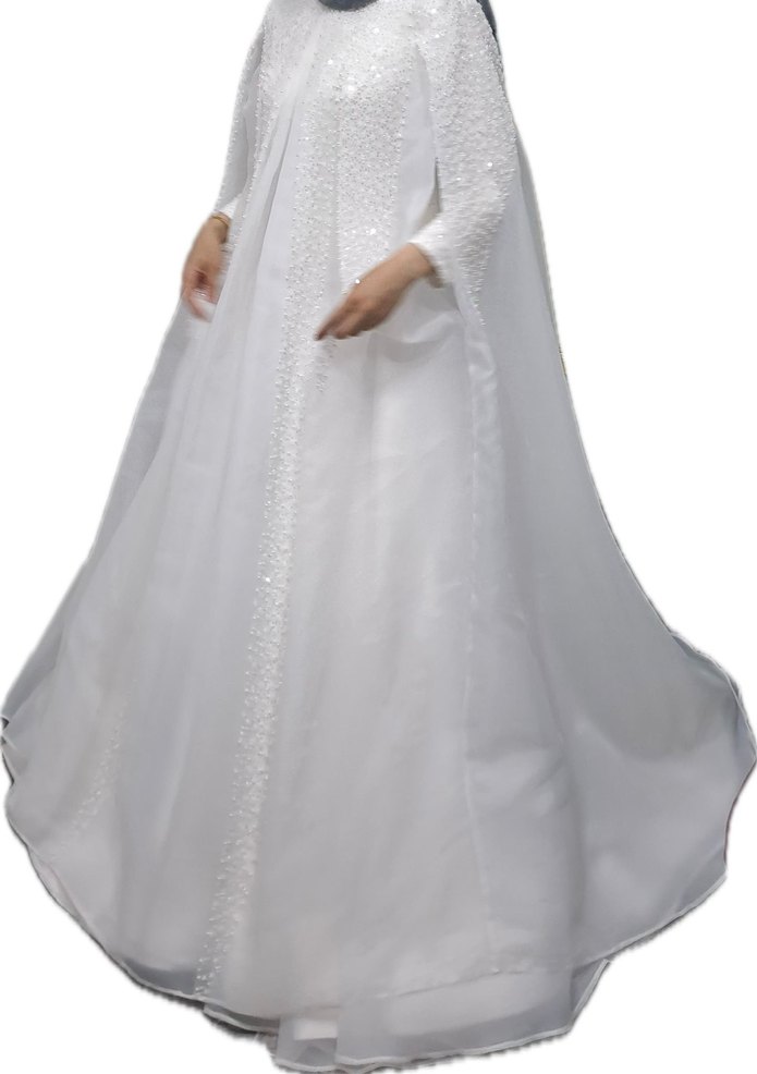 Uzun beyaz, drape detaylı, uzun kollu kadın abiyesi. Bol kesimli ve straplez yakalı, düğünler için uygun, mütevazı ve bohem tarzda.
