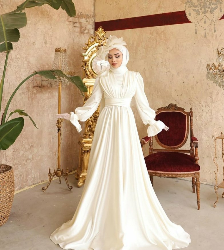 Yüksek yakalı, uzun kollu ve drapeli detaylara sahip uzun beyaz gelinlik, vintage etnik tarzı yansıtır.