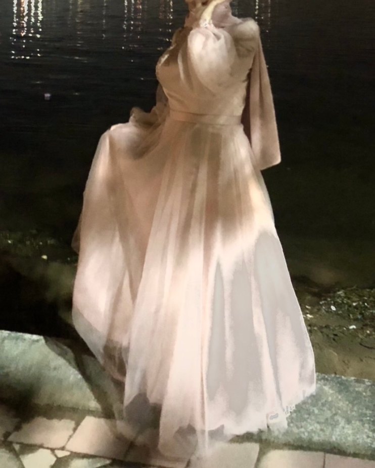 Uzun, straplez beyaz elbise, drapeli tasarım, uzun kollu ve bol kesim. İpek gibi kumaştan, klasik zarafeti bohem Paris tarzıyla sunar, düğünler için uygun.