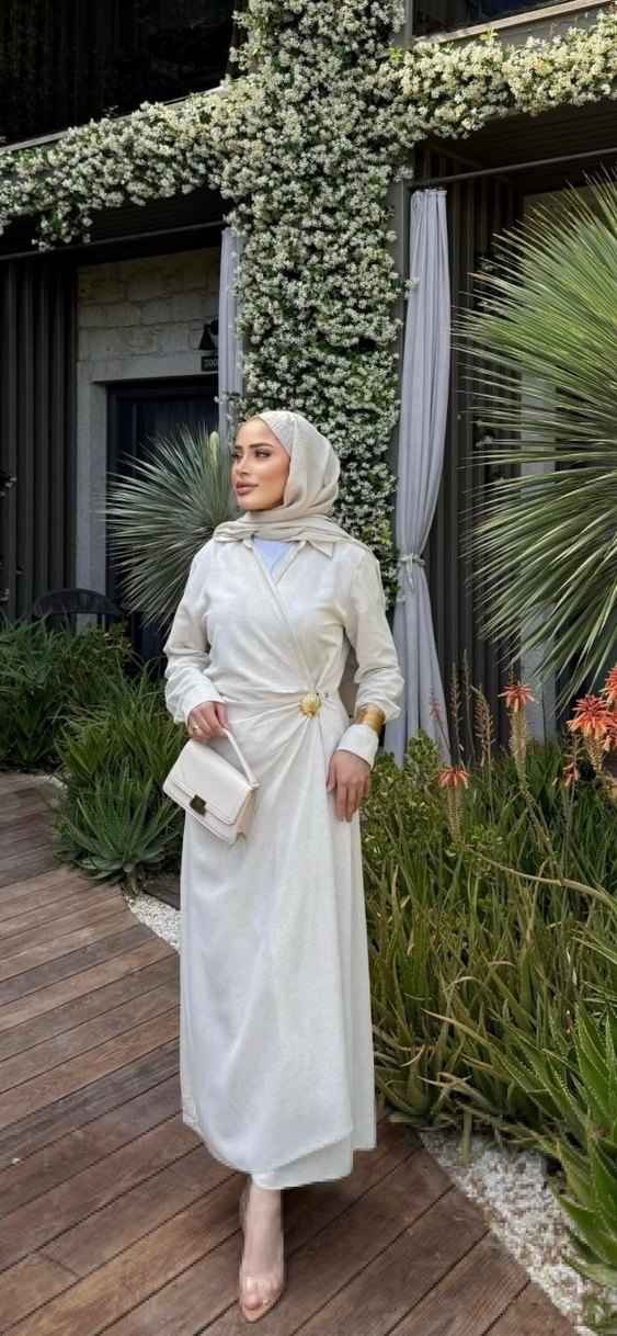 Uzun beyaz elbise, drapeli tasarımı, notalı yaka ve uzun kollu. Etnik desenli, rahat kesim, yumuşak sentetik kumaştan, minimal bohem stilinde.