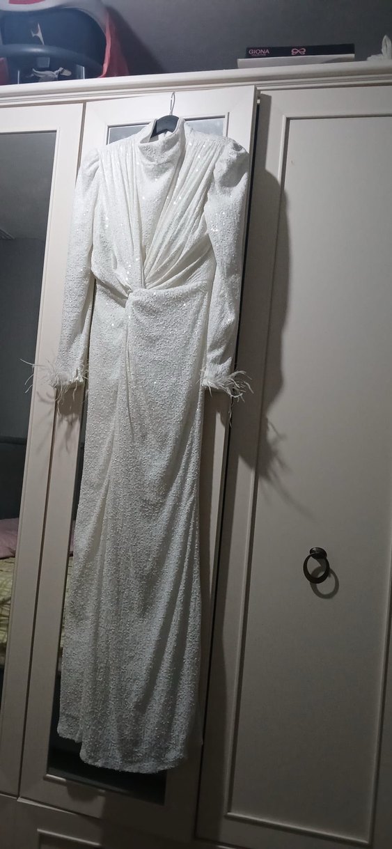 Yüksek yakalı, uzun kollu ve drapeli tasarıma sahip beyaz, vücuda oturan uzun gelinlik. Manşetlerde ince tüy detayları bulunur. Bohem ve avangart tarzda.