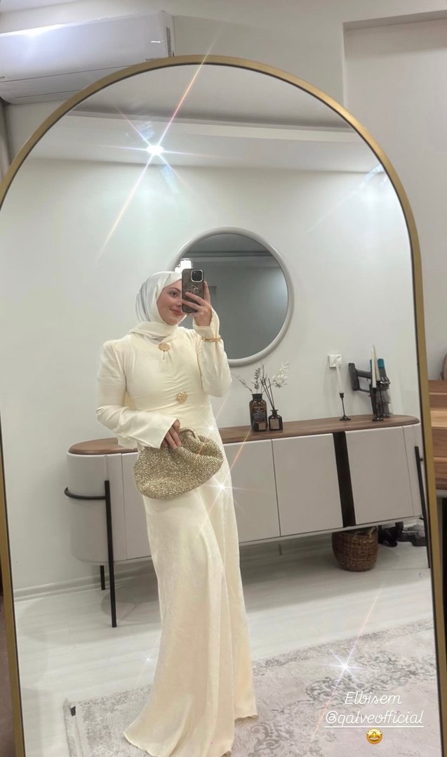 Uzun beyaz elbise, yüksek yakalı, uzun kollu ve drapeli ipek gibi kumaştan. Modern klasik ve sade, düğünler için uygun. ✨