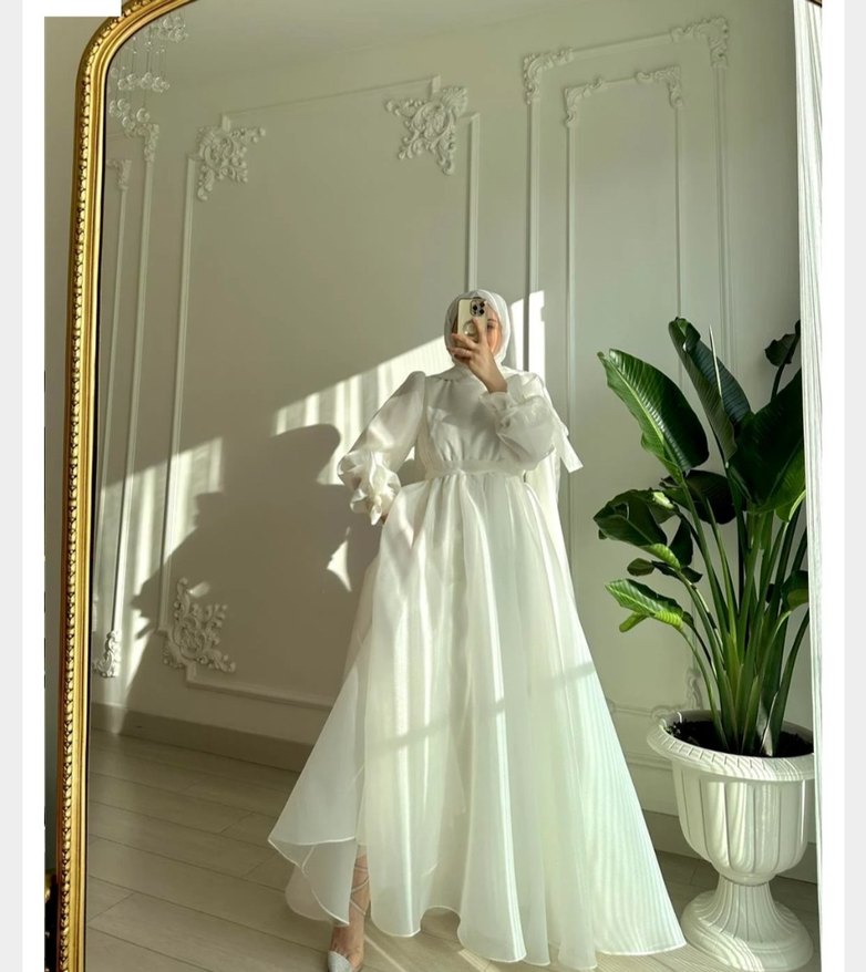 Uzun beyaz drapeli, yüksek yakalı ve bol kesimli bu abiye, modern klasik ve minimal bir tarz sunar. İnce askılı kollara sahip, desen içermeyen sade kabarık ağır bir modeldir. Nikah için tercih ediliyor. 36-38-40 beden uyumlu