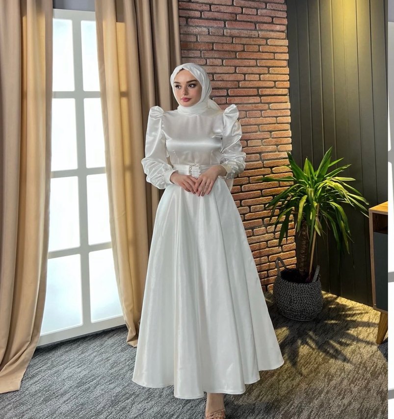 Yüksek yakalı ve uzun kollu, drapeli detaylara sahip uzun beyaz abiye. Düzenli kesim ve klasik tarzda, düğünler için uygun. ✨ #gelin