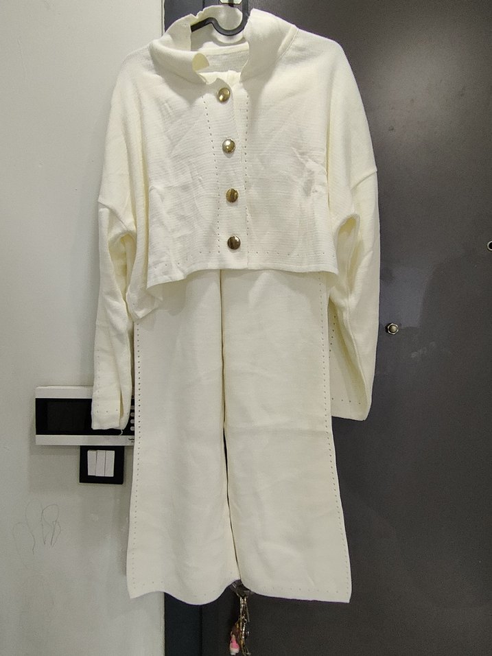 Düğmeli, beyaz uzun ikili takım normal kesim ve uzun kollu, günlük kullanıma uygun.