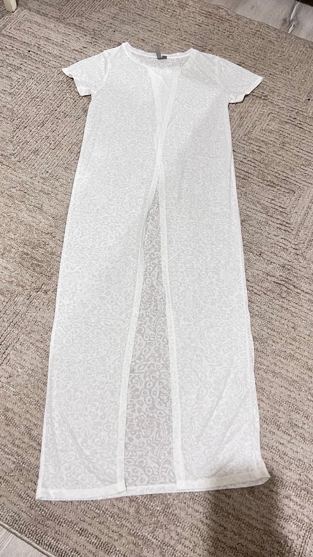 Uzun ve beyaz renkte, bohem tarzda, kolsuz ve vücuda oturan kadın elbisesi. Minimalist ve sade bir görünüme sahiptir. Ölçüler verildi küçük lekesi var yıkannca çıkar