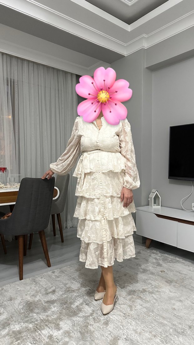 Bu uzun beyaz elbise, bol kesim, fırfırlı detaylar ve yüksek yakaya sahiptir. Yumuşak sentetik kumaştan yapılmış, çiçek desenli ve askılı kolludur, bohem düğünler için uygundur.
