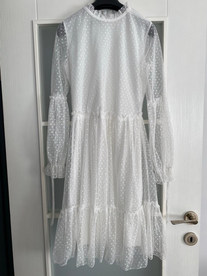 Uzun beyaz elbise, ince askılı kollu ve yuvarlak yakalıdır. Nakış detayları ve fırfır süslemeleri bulunur. Bol kesim, bohem tarzda, yumuşak sentetik kumaştan yapılmıştır.