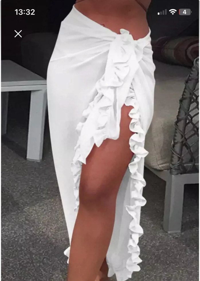 Uzun beyaz pareo, yan yırtmaçta fırfırlar, kullanimi rahat bir kere fotograf icin kullanildi