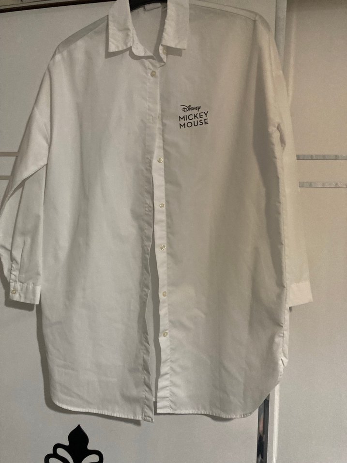 Yumuşak pamuklu, baskılı Mickey Mouse desenli beyaz uzun kollu hamile tişörtü, bol kesim ve normal boyda. Günlük kullanım için uygundur.