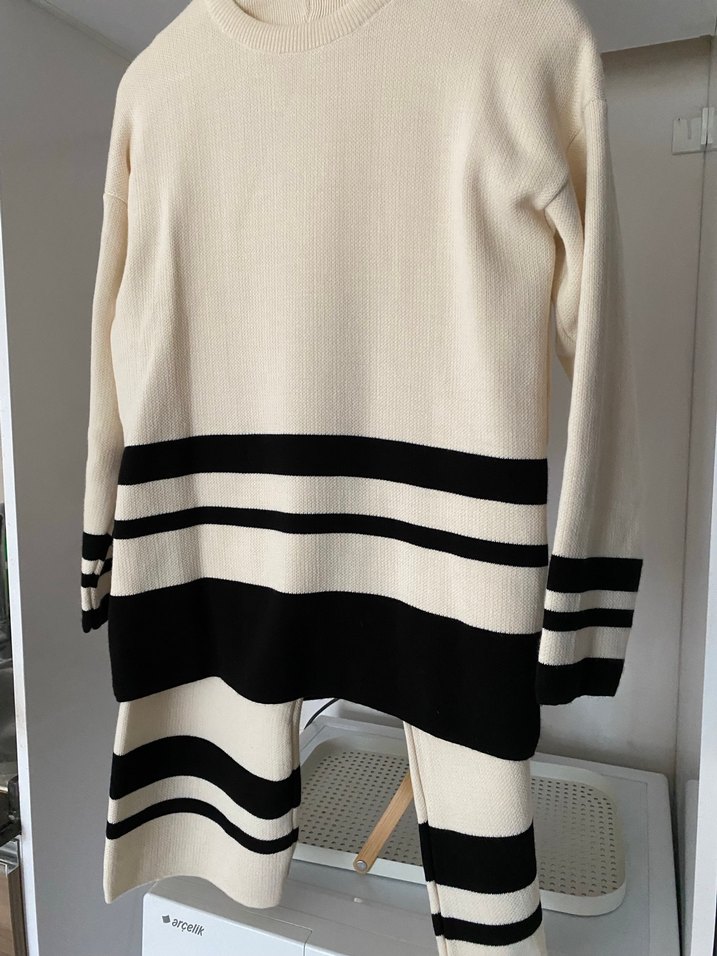 Kadınlar için uzun, bol kesim ve yuvarlak yaka örgü yün kazak. Beyaz ve gri çizgili desenlerle günlük kullanıma uygundur.